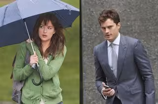 Más tarde, y sin Dornan en el set, aparecía Johnson con paraguas y rebeca verde, resguardándose de la lluvia para rodar nuevas escenas, o regrabar algunos planos ya filmados, sin la colaboración del protagonista masculino.