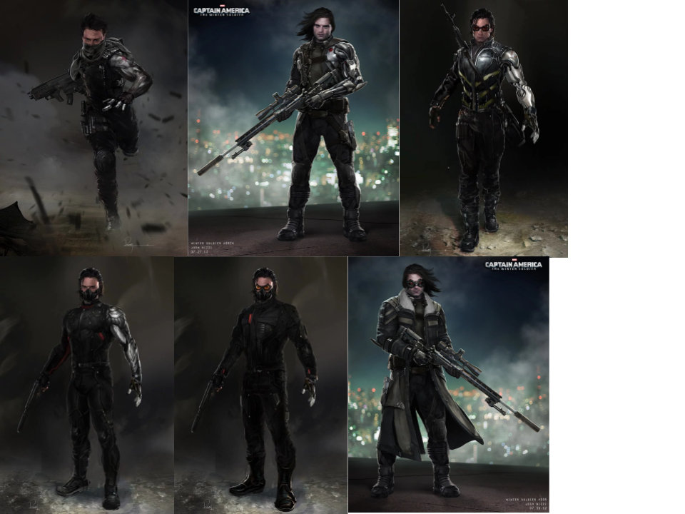Estos concept-art han sido publicados en Reddit y revelan hasta seis diseños diferentes del personaje interpretado por Sebastian Stan. En todos ellos el Soldado de Invierno luce su característico brazo metálico, aunque el diseño específico del mismo cambia bastante en los diferentes bocetos. La máscara que cubre su rostro es otro de los elementos que sufrieron diversas evoluciones en las diferentes etapas de preproducción.