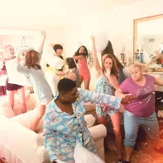 Una guerra de almohadas es la protagonista absoluta de la primera fotografía, que muestra a todas las protagonistas en un ambiente distendido y disfrutando de esta particular forma de diversión.