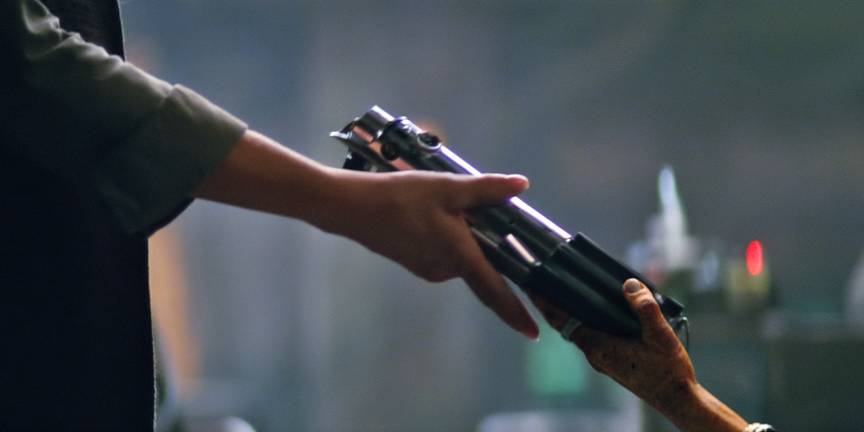 En el Despertar de la Fuerza se ve como Rey recibe el sable de luz azul que Luke perdió en 'El Imperio contraataca' cuando Vader le corta el brazo. En este caso, es Maz Kanata la que lo escondía durante la última película, aunque se desconoce cómo llegó a sus manos.