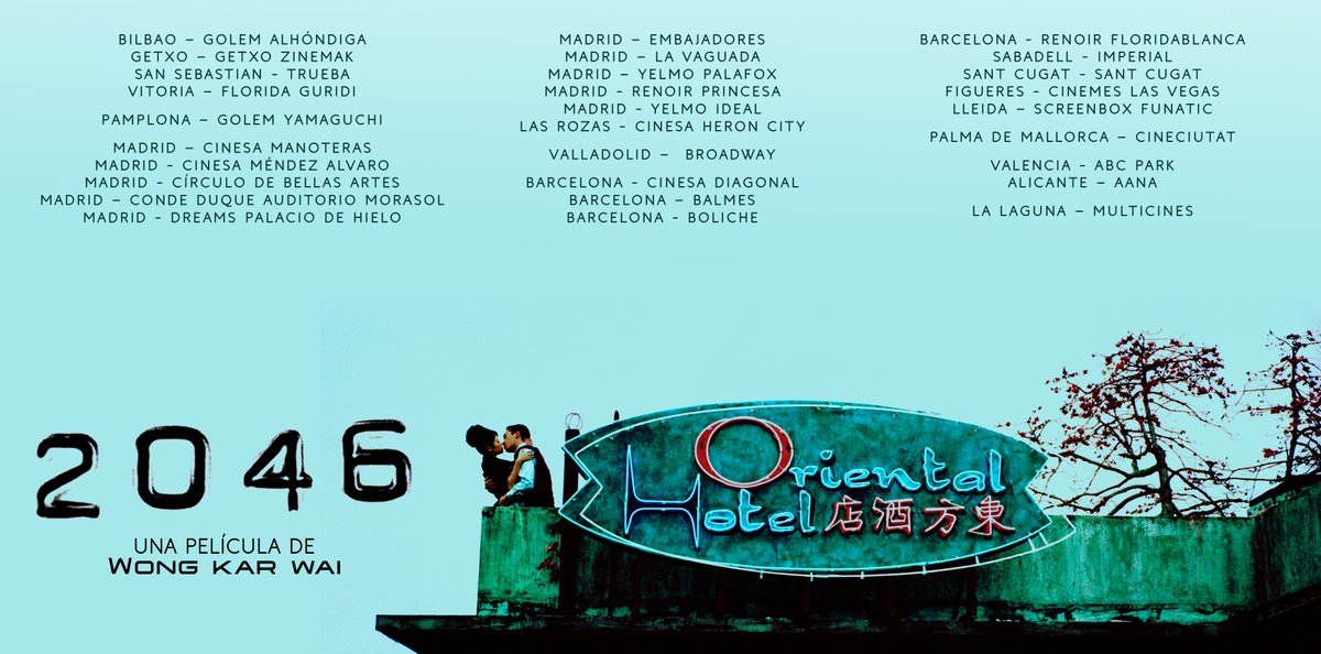 '2046' se reestrenará en 30 cines de toda España. Además, el filme podrá también disfrutarse en las alas que actualmente están proyectando el ciclo completo de Wong Kar Wai por todo el país y en el Universo Wong Kar Wai de los Cines Renoir Princesa de Madrid y los Cinemes Boliche de Barcelona.