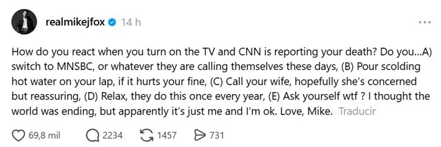 "¿Cómo reaccionas cuando enciendes la tele y la CNN está informando de tu muerte?", preguntó Fox a sus seguidores en un texto en el que, acto seguido, ofrecía varias y variopintas propuestas no exentas de ironía tras el error de la cadena de informativos.