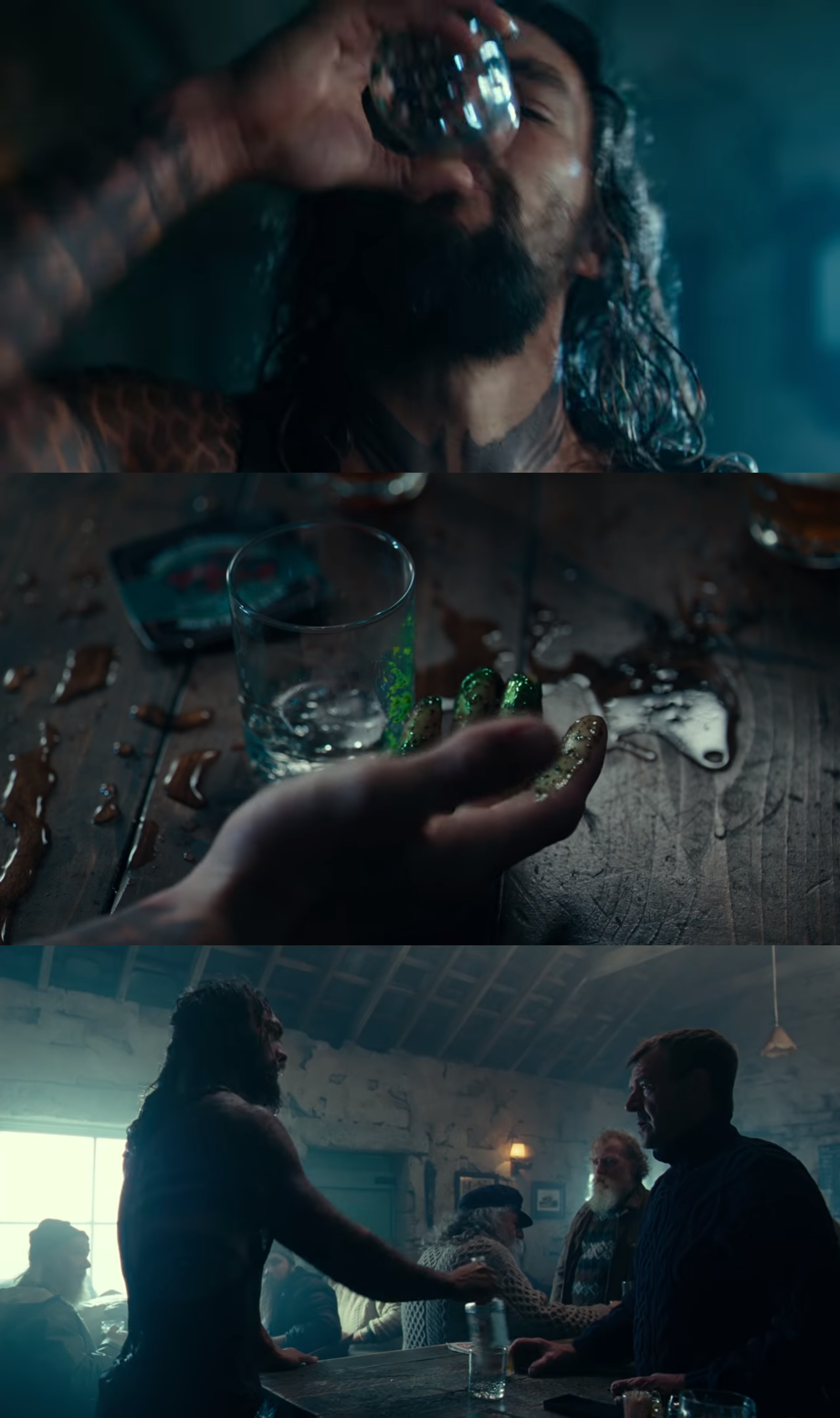 El error ha sido encontrado por un usuario de Reddit y tiene que ver con una sustancia verde en las manos de Jason Momoa. Tal y como muestran las imágenes, ni en el plano del actor bebiendo ni en el plano general tiene la mano manchada, sin embargo hay un plano detalle en el que mano y vaso están claramente sucias.