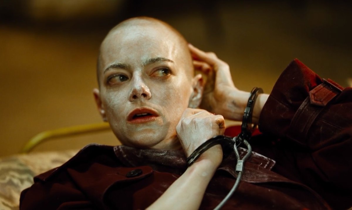 "¿Y mi pelo?", pregunta una desorientada y esposada Michelle, el personaje encarnado por Stone, mientras se toca su cabeza. "Tu pelo ha sido destruido. Sí, te hemos rapado el pelo para evitar que contactes con tu nave", explica Jesse Plemons, que forma parte de una singular organización autodenominada 'Resistencia Humana'. "¿Mi nave? ¿Qué nave?", responde ojiplática.