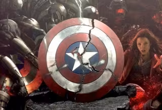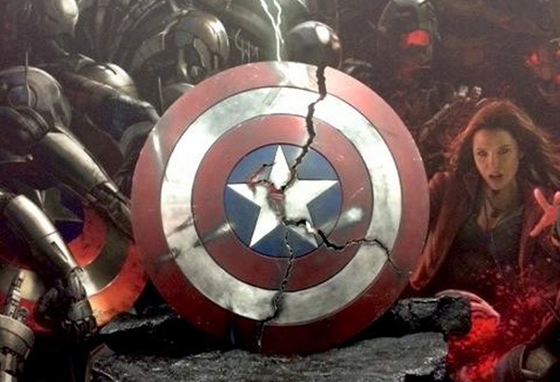 Con el banner de la película como fondo, los fans del mayor evento mundial de comics pudieron disfrutar de una réplica del escudo de Steve Rogers, prácticamente hecho añicos. Tres grandes grietas que, según vemos en los tweets de @Marvel y @Avengers, delatan el enorme poder de un gran enemigo, quizá Ultrón.