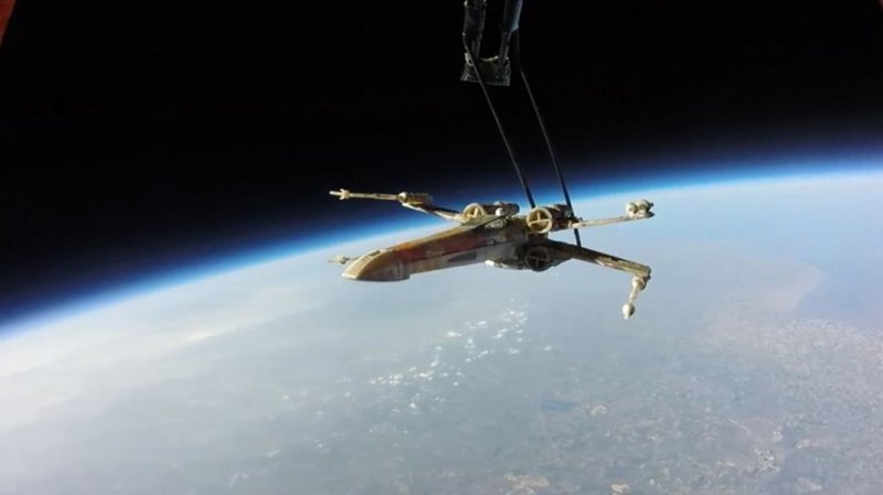 Matt Kingsnorth y Phil St. Pier, los responsables, trabajan en el proyecto Helium Tears, que consiste en fotografiar la tierra desde el espacio utilizando cámaras GoPro y globos de gran altitud. Gracias a la tecnología y los medios que este proyecto les facilitó, consiguieron atar un modelo de la nave X-Wing a uno de los globos y grabarlo, literalmente, en el espacio.