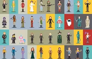 Esta ilustración, titulada Hall of Heroes, es una joya para cualquier coleccionista. En ella aparecen las mujeres más 'guerreras' o con mayor liderazgo de la historia del cine y la televisión. ¿Puedes ver a Scully, la racional agente especial de Expediente-X? ¿Y podrías situar a la simpática robot Eva de Wall-E?