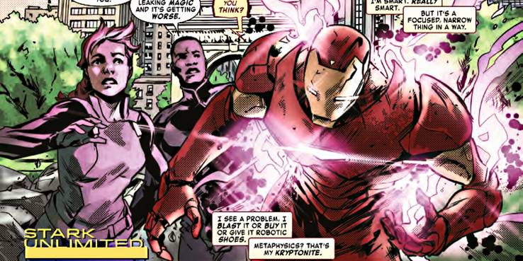 En este número, Tony Stark reconoce su verdadera debilidad, a pesar de su gran inteligencia y capacidad para superar los problemas a los que tiene que enfrentarse. Tal y como se describe a sí mismo, "soy listo, realmente listo". Sin embargo, admite que cuando tiene que confrontar un problema, "lo exploto, lo compro o le pongo zapatos robóticos". El personaje hace entonces referencia al único elemento contra el que Superman no tiene nada que hacer: "Metafísica. Esa es mi kryptonita".