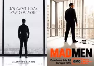 Siendo realistas, las fotos guardan demasiadas similitudes. Tanto Jamie Dornan -que interpreta a Christian Grey- como Jon Hamm -Don Draper en 'Mad Men'- aparecen de pie frente a una gran cristalera de un rascacielos. La única diferencia es que Dornan aparece completamente de espaldas mientras que el plano desde el que se toma la foto de Hamm permite apreciar la mitad de su rostro.
