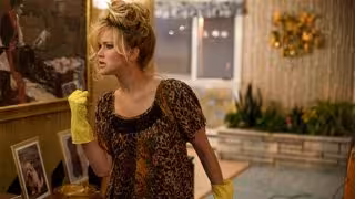 Lawrence se mete en la piel de la inestable Rosalyn Rosenfeld, papel por el que fue nominada al Oscar a la mejor actriz de reparto, premio que le arrebato Lupita Nyong'o por su interpretación en 12 años de esclavitud.