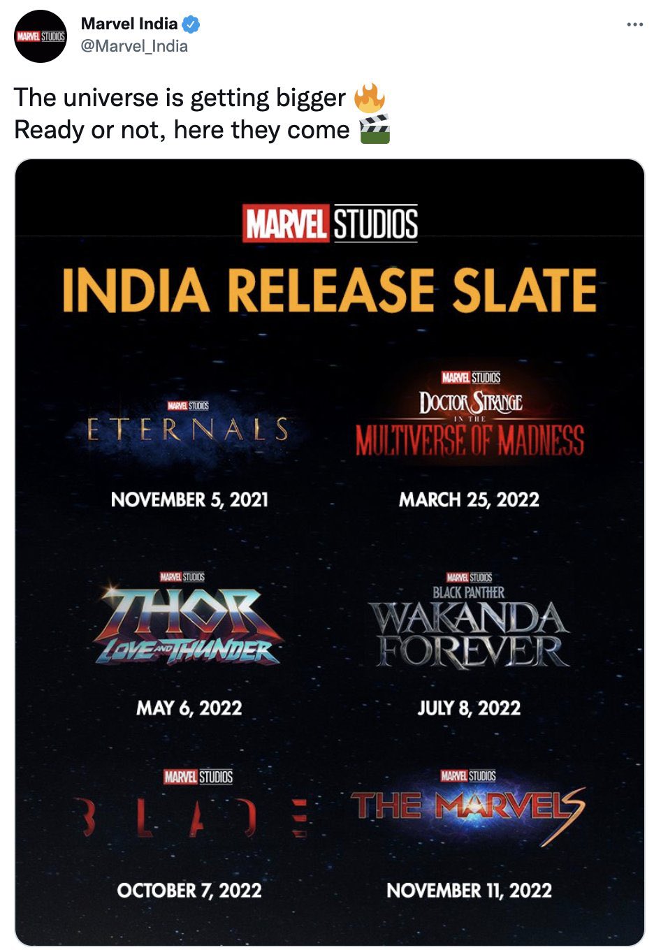 Entre las películas que aparecen en el calendario se encuentran Eternals el 5 de noviembre de este año, Doctor Strange in the Multiverse of Madness el 25 de marzo de 2022, Thor: Love and Thunder el 6 de mayo de 2022, Black Panther: Wakanda Forever el 8 de julio de 2022 y The Marvels el 11 de noviembre de 2022.