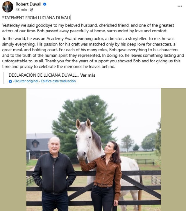 Duvall murió "pacíficamente" en su residencia de Middleburg, Virginia, rodeado de sus seres queridos. Su esposa Luciana anunció la noticia públicamente a través de Facebook este lunes 16 de febrero.