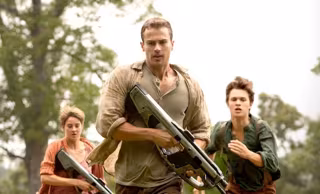 En la imagen, lanzada semanas después de su primer teaser, vemos a Shailene Woodley, Theo James y Ansel Elgort. Los tres corren por un campo, mientras dos de ellos sujetan unas armas con una tecnología futurista.