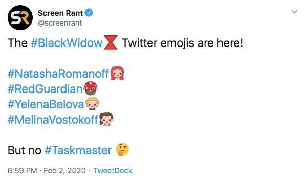 Tras el lanzamiento de estos emoticonos, la cuenta de Screen Rant recopiló en una publicación a los personajes del filme protagonizado por Scarlett Johansson junto a sus imágenes asociadas, terminando con una reflexión: "No está Taskmaster". En cambio, el personaje de Rachel Weisz, Melina Vostokoff, sí contaba con su propio emoji, confirmando que su papel será de los más relevantes en el filme.