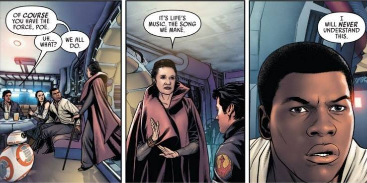 Poe no tarda en negarlo, diciendo que no cree que esa acción fuera resultado de la Fuerza. Entonces, llega Leia, que dice, tajante: "Por supuesto que tienes la Fuerza en ti, Poe. Todos la tenemos. Es la música de la vida, la canción que hacemos continuamente".