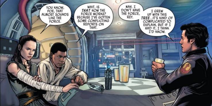 Una pista definitiva sobre esta "democratización" de la Fuerza la dio el número 28 del cómic Star Wars: Poe Dameron, que contiene una escena justo después de Los últimos Jedi. Los tres protagonistas, Rey, Finn y Poe hablan de cuentos y leyendas, y éste último relata una historia que a Rey le parece especialmente relacionada con la Fuerza.
