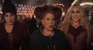 Otra secuencia muestra a un habitante de la ciudad dando la bienvenida a las brujas. "Son las hermanas Sanderson. Apuesto a que estáis buscando el escenario", dice un hombre. "Siempre", contesta Winifred.