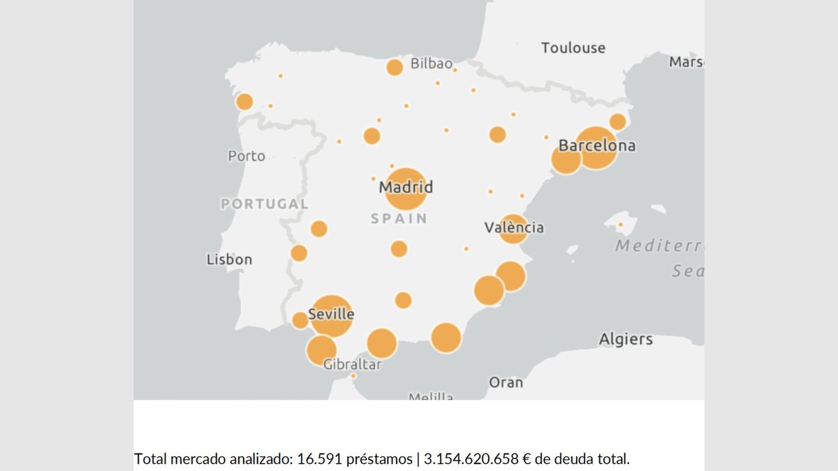 El análisis provincial confirma una alta concentración de la actividad, tanto en número de operaciones como en volumen de deuda. Barcelona, Sevilla y Madrid lideran el mercado por número de préstamos, superando conjuntamente las 4.500 operaciones. Junto a estas provincias, el arco mediterráneo concentra también un volumen significativo de operaciones, mientras que determinadas provincias del interior presentan deudas típicas elevadas pese a un menor número de préstamos.
