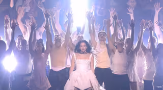 La canción arrancó en clave operística, con la cantante interpretando pasajes en alemán, arropada por la Heritage Orchestra, y con un coro dispuesto en semicírculo. Una puesta en escena casi litúrgica: ella de blanco, los músicos de negro, y una iluminación austera que subrayaba el tono solemne. A medida que avanzaba la canción, la performance fue deslizándose hacia la electrónica, con un beat cada vez más marcado y una progresión visual que anunciaba la metamorfosis de la "iglesia" en club.