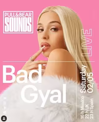 Este sábado 2 de mayo a las 23:00 hora española (16:00 en México) se podrá disfrutar de un concierto en directo de Bad Gyal, la sensación de la escena urbana del momento, en la cuenta de Instagram de @pullandbear.