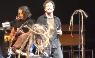 Pues bien, dicho y hecho, ante el cachondeo general de músicos y público, aparecieron en escena las enormes rastas a punto de ser cercenadas. La imagen de Eddie Vedder cantando con un micrófono en una mano y una maquinilla de afeitar en la otra es impagable.