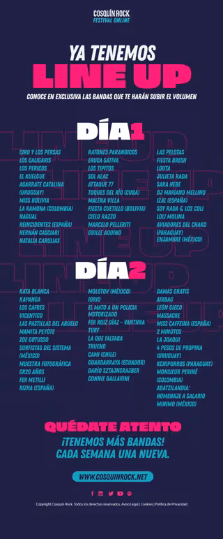 Las fechas serán el 8 y el 9 de agosto de 2020 y se podrá disfrutar a través de streaming. En su cartel destaca la presencia de más de 60 artistas solistas y bandas que tocarán desde diferentes países como Uruguay, Paraguay, Chile, Colombia, Argentina, México, Perú, Estados Unidos y España, entre otros.