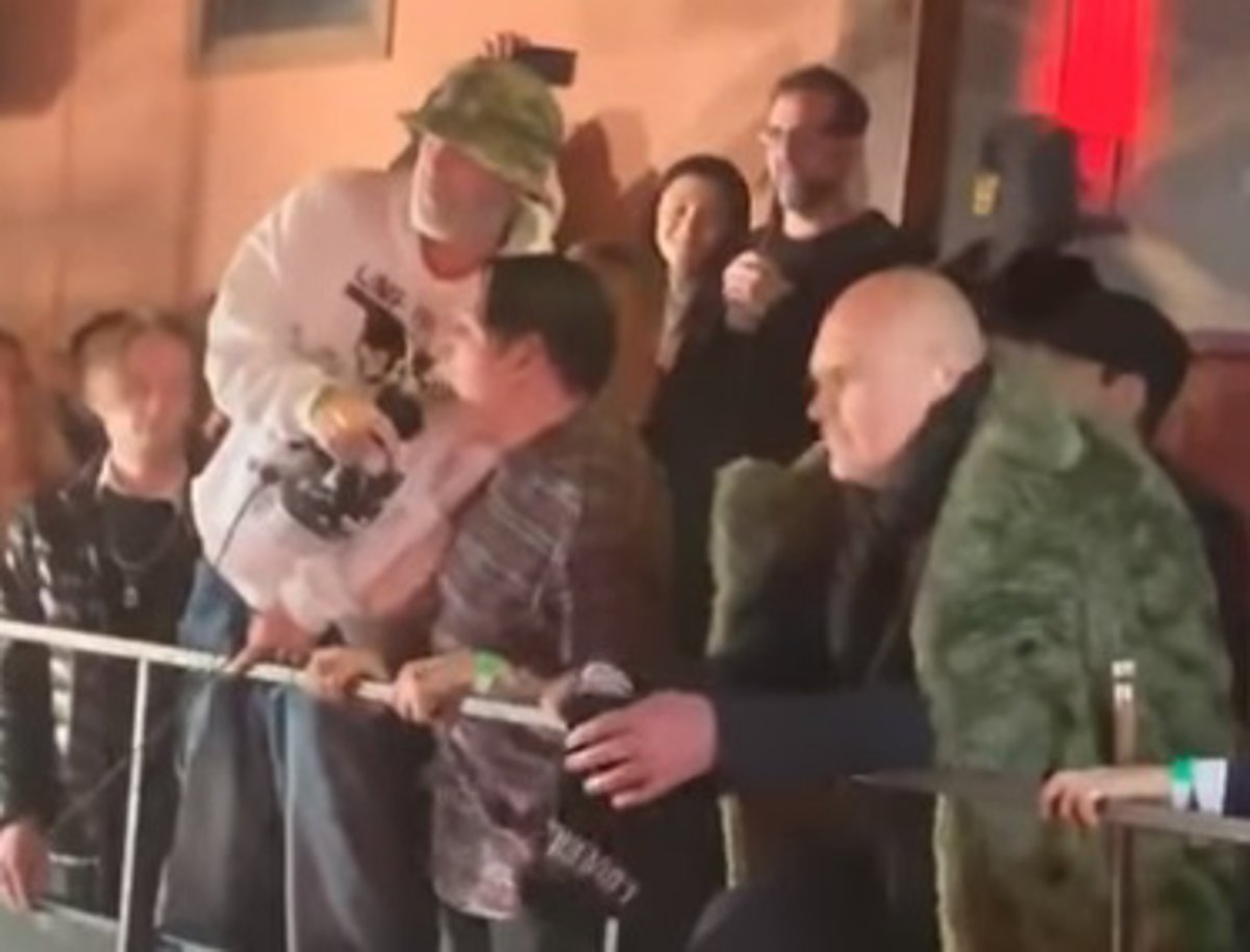 Mientras la pareja está pasándoselo en grande, aparece Billy Corgan de Smashing Pumpkins a su lado, menos participativo, pero igualmente meneando la cabeza al ritmo de la música.