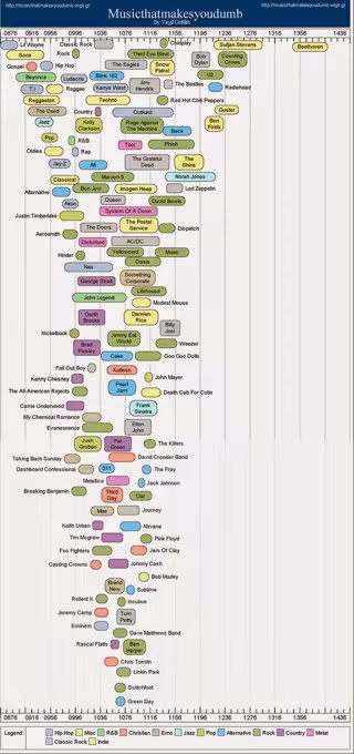 En el resultado final, titulado 'Music that makes you dumb' (clicka en la imagen de la izquierda para ampliar), comprobamos que, según este estudio, los más inteligentes escuchan, con clara diferencia, a Beethoven. De hecho, la distancia sobre el resto es tan amplia que prácticamente no puede ni comentarse por exceso de elitismo.