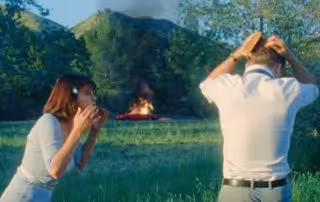La conversación de la pareja tiene un estilo de película muda en el vídeo con subtítulos cuando se escabullen por una ventana y roban un automóvil que terminan incendiando para evitar acabar entre rejas.