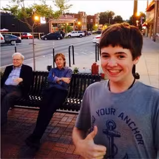 El artista estaba sentado en un banco, junto al millonario Warren Buffett. Y con este fondo, el adolescente de Nebraska decidió hacerse un autoretrato que inmortalizara el momento.