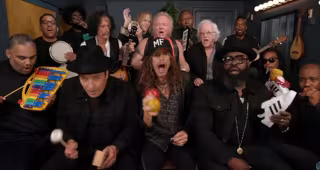 Steven Tyler canta mientras toca la armónica rodeado por los integrantes de esta extensa banda en la que sus compañeros en Aerosmith Joe Perry, Joey Kramer, Tom Hamilton y Brad Whitford hacen su parte sonrientes con un resultado como poco notable.