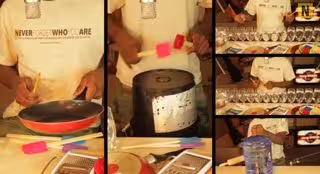 vasos de cristal, una botella de agua, una sartén y otros enseres de uso diario.