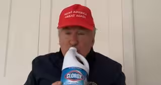 "Felicitaciones a la promoción de Covid-19", arrancó este fake Trump que, tras denunciar que "me han tratado muy mal, incluso peor de lo que trataron a Lincoln" en un momento de su intervención, bebe una botella de lejía.