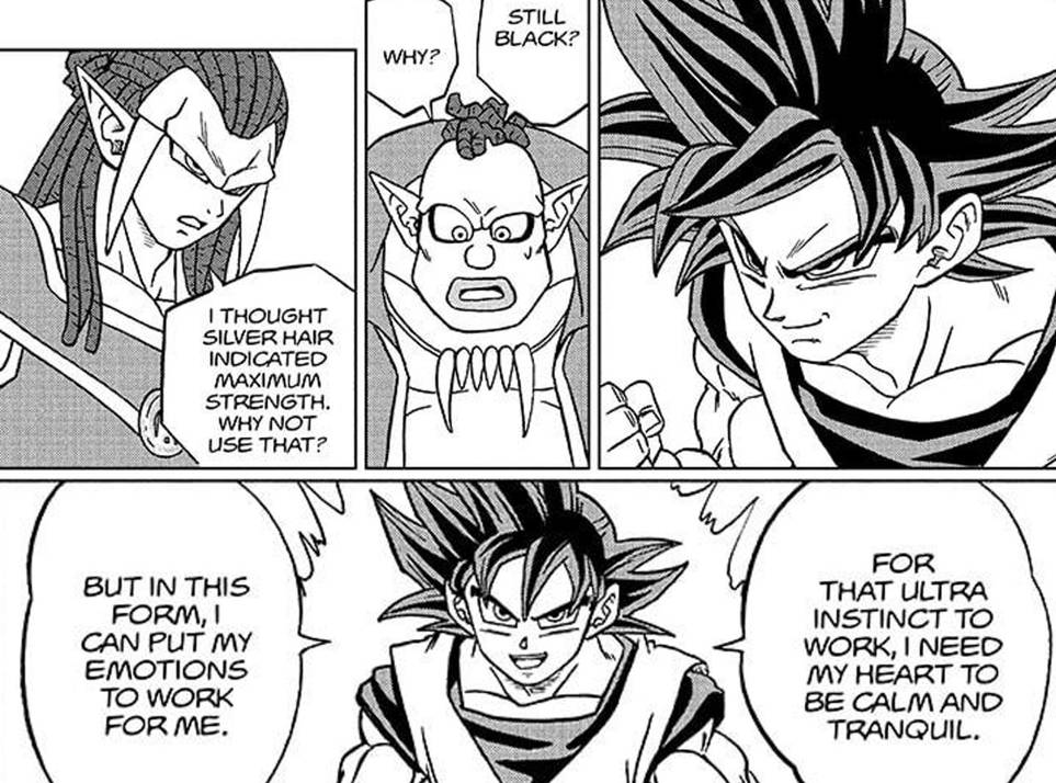 La nueva versión del Ultra Instinto de Goku cambia por completo el concepto original de llegar a un estado de calma extraordinario, dejando vacíos la mente y el corazón. En realidad, esto era un hándicap para Goku, quien está fuertemente influenciado por sus emociones. Esta nueva versión derrumba ese concepto, convirtiendo su lado emocional en su principal arma, lo que le permite llegar a niveles de poder sin precedentes, que lo convierten en su forma más poderosa hasta la fecha.
