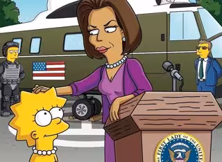 Sin embargo, los fans más fieles de Los Simpson saben que Michelle Obama ya apareció en la serie, en un episodio de la vigésimo primera temporada en el año 2010. Aunque no fue la Primera Dama quien puso voz a su versión animada sino que fue la actriz de American Horror Story, Angela Bassett quien dobló al personaje. En ese capítulo, Michelle visitaba el colegio de Springfield para defender a Lisa y a sus amigos de los que se metían con ella.