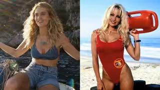 Lily James luce el icónico bañador de Pamela Anderson en Los vigilantes de la playa en la nueva imagen de Pam & Tommy - UNIVERSAL/ GTG ENT