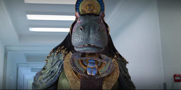 Es entonces, Marc y Steven emprenden juntos la huida por los pasillos del manicomio hasta que, detrás de una puerta, aparece un hipopótamo enorme vestido con un traje propio de las deidades egipcias. "¡Hola!", saluda afable el mastodóntico ser con voz de mujer desatando el alarido de unos aterrorizados Grant y Spector. Pero pese a su medrosa reacción, Steve y Marc deberían estar, en principio, más tranquilos ya que todo indica que se trata de Tueris 'La Grande', también conocida como Tauret o Taweret, la diosa egipcia de la protección y fertilidad.
