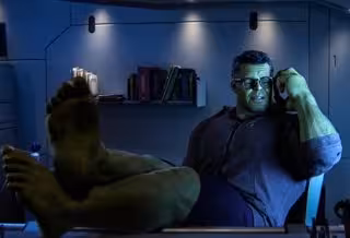 Pero lo más impactante tiene lugar después, cuando los primos se despiden por teléfono. "¿Vendrás pronto a Los Ángeles?", le pregunta Jennifer. "Sí... bueno, ahora no puedo ir. Debo ocuparme de otras cosas", conesta Banner y es entonces cuando el plano se abre y los espectadores descubren que Hulk ha estado hablando con su prima mientras viajaba en una nave espacial rumbo a un lugar desconocido... hasta ahora.