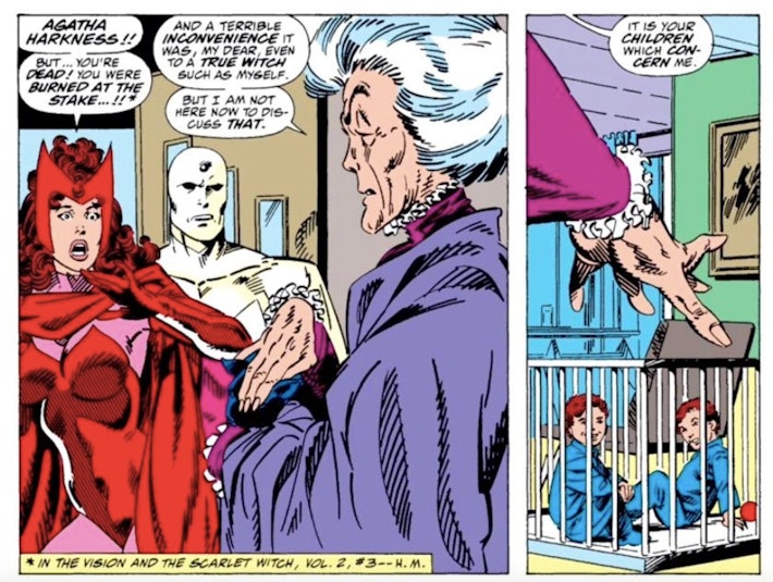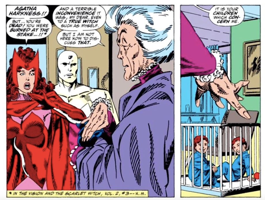 A esto hay que añadirle que la única hechicera relacionada con Bruja Escarlata en los cómics es precisamente Harkness, siendo ella quien la ayuda a controlar y desarrollar sus poderes, y la guía en su embarazo psicológico, algo que también parece estar presente en el tráiler, en el que la pareja aparece cuidando de sus hijos gemelos.