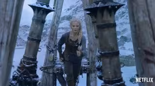 Allí, el personaje interpretado por Allan se somete al duro entrenamiento propio de los aprendices de brujo. La joven se esfuerza al máximo por superar un peligroso circuito de obstáculos entre la nieve mientras es observada por dos compañeros de Geralt.