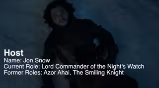 Durante los 3 minutos que dura, uno pasa un día en la vida como Guardia de la Noche de Jon Nieve bajo la ya reconocible música de Ramin Djawadi para Westworld, desde que resucita, pasea bajo el frío, habla con Sam, entrena con la espada, charla con Jeor Mormont, mata a Qhorin Mediamano, escucha a Ygritte un "You know nothing" hasta que es traicionado y asesinado por Allison Thorne y sus secuaces.